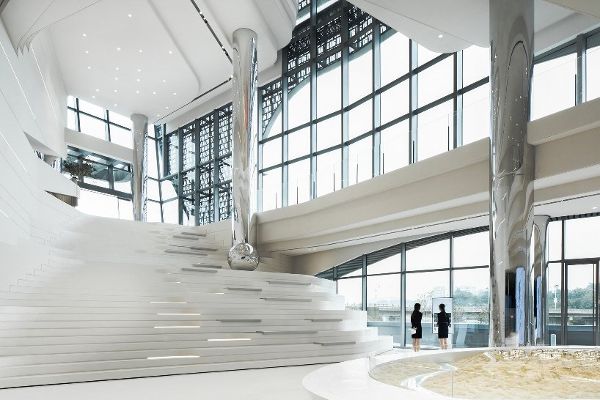 這個(gè)采光充足的大型中庭將所有主要功能連接在一起,用作接待和展覽廳。較低的樓層提供休閑和健康設(shè)施,包括室內(nèi)游泳池、健身房和兒童游樂區(qū)。所有的空間都直接連接到外部露臺(tái),提供人以廣闊的視野和精心設(shè)計(jì)的景觀。主樓的外觀設(shè)計(jì)采用了獨(dú)特的形式和材料。