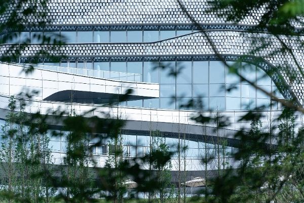 坐落在山頂上的三層玻璃體量包裹著一個(gè)輕質(zhì)的屏風(fēng)式立面。遮光的立面覆蓋著有角度的穿孔金屬板,以捕捉和反射光線,創(chuàng)造一種起伏運(yùn)動(dòng)的感覺。這些板通過一個(gè)輕型鋼骨架連接到主體結(jié)構(gòu)上,有助于開闊視野,并平衡開放與隱私的感覺。