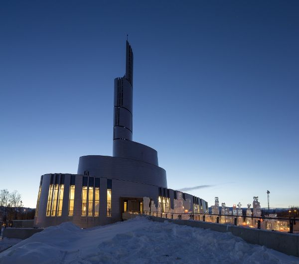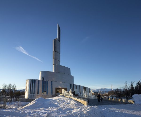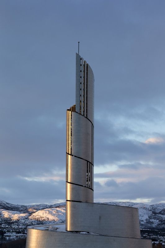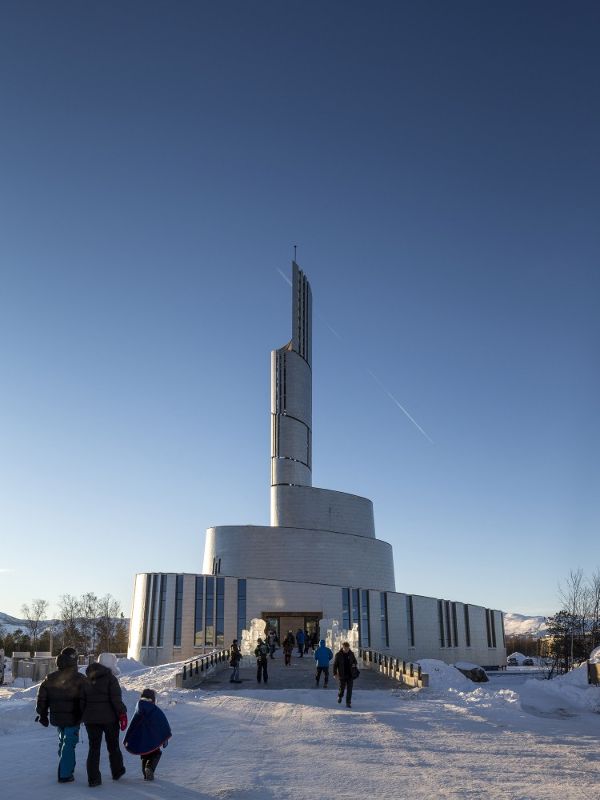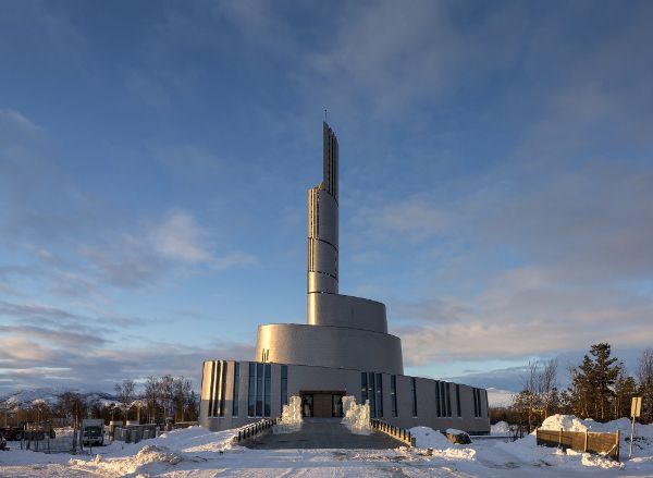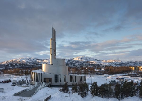 北極光的含義在教堂的建筑結構中也有所體現。這座教堂的輪廓呈螺旋形向上延伸,直至地面上方47米高的鐘樓頂端。立面覆蓋著鈦金屬材料,反射出漫長而黑暗的北極冬季里美麗的北極光,同時也強調出人們對于觀察這種現象的感受。