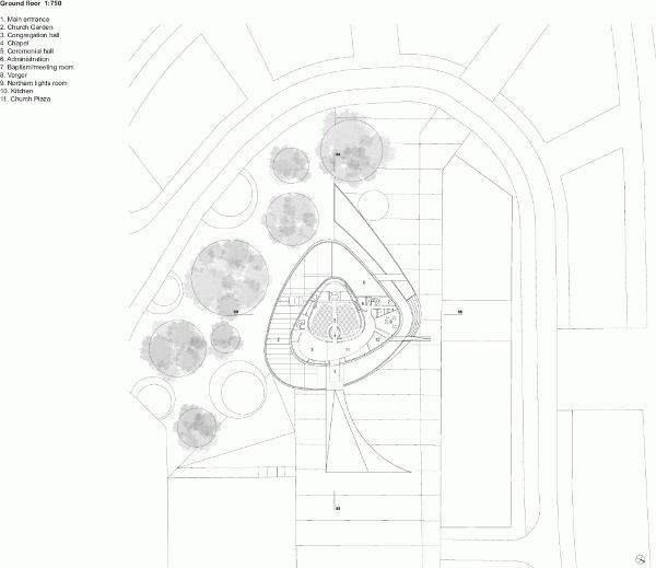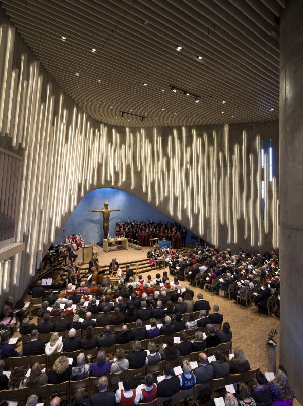 在教堂內部的主要區域中,教堂房間與建筑物的動態外觀形成了一種溫和的對比效果。墻面使用原始混凝土,地板使用木材,面板和天花板也都強調了北歐地區的大環境。日光透過狹長的不規則放置的玻璃照射進來。從天窗射進的光線照亮了圣壇后方的整面墻,在房間內營造出一種獨特的氛圍。