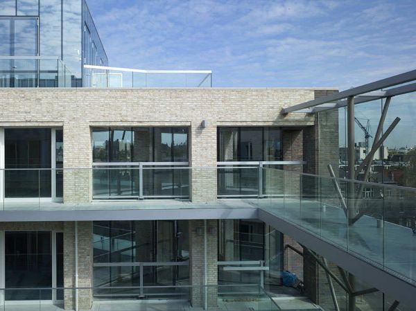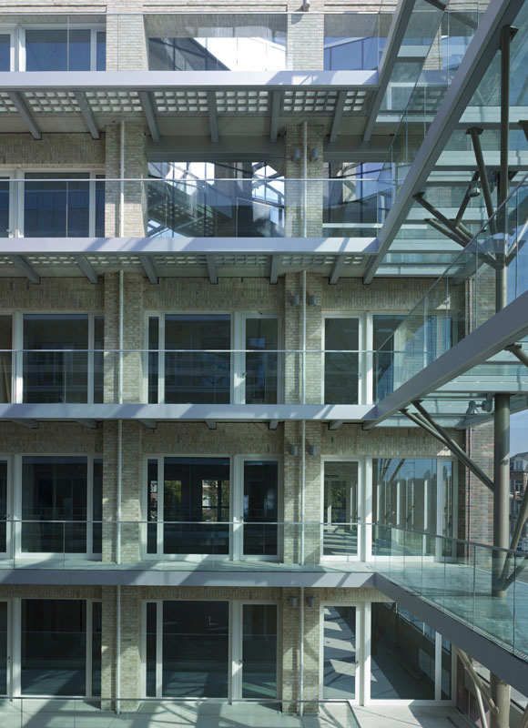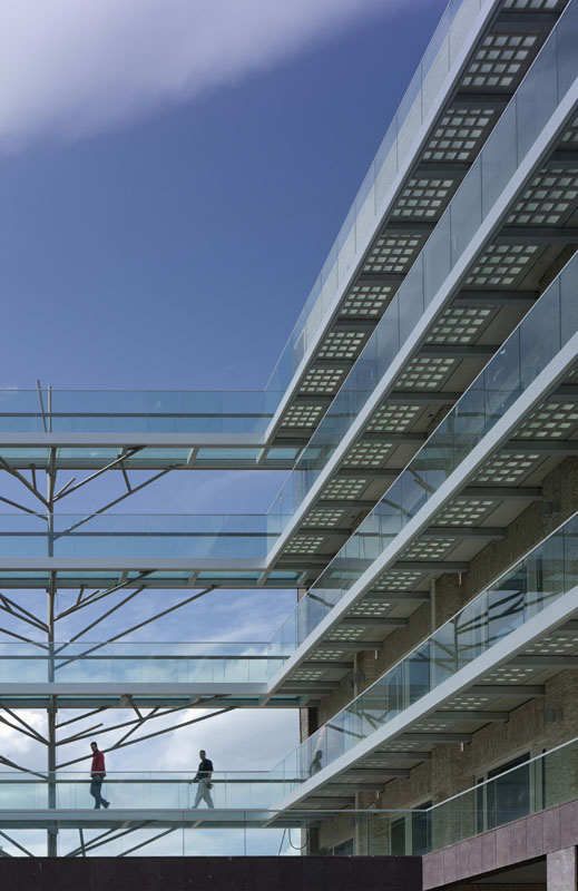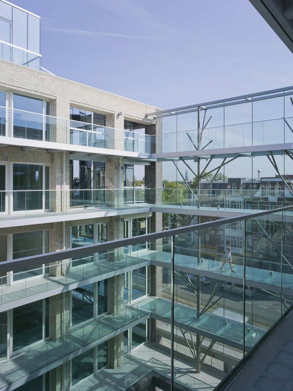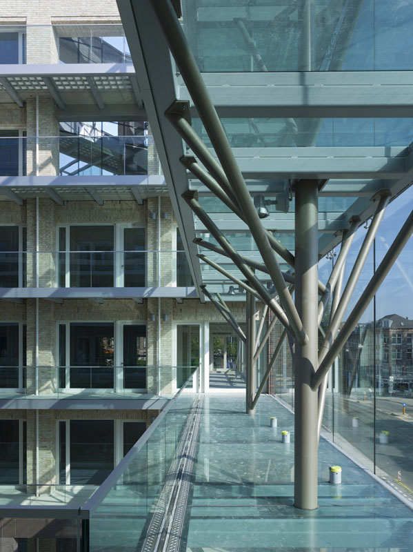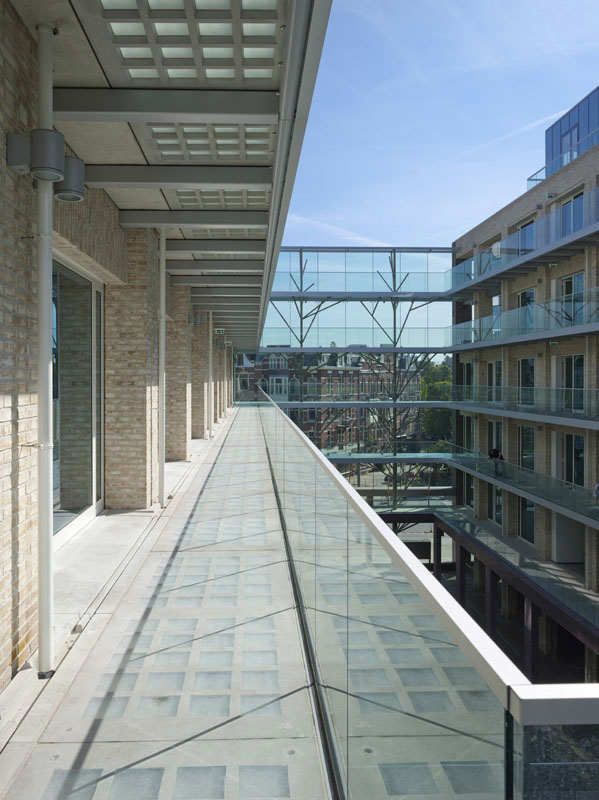 ?建筑設計中的一個關鍵元素就是從Constantijn Huygenstraat大街延伸而來的中央庭院,庭院中包含商店、咖啡館和各種公共設施,可從樓上的過道陽臺俯瞰到這里。考慮到建筑物的位置毗鄰運河,位置顯要,事務所有意將庭院設計為一處當地的公共場所。6層高的玻璃隔聲屏障遮住了來自Constantijn Huygenstraat大街上的喧囂,留給庭院一片清靜。在隔聲屏障后方,由抽象的“鋼樹”支撐的玻璃連橋連接著庭院對面的預制混凝土過道陽臺。