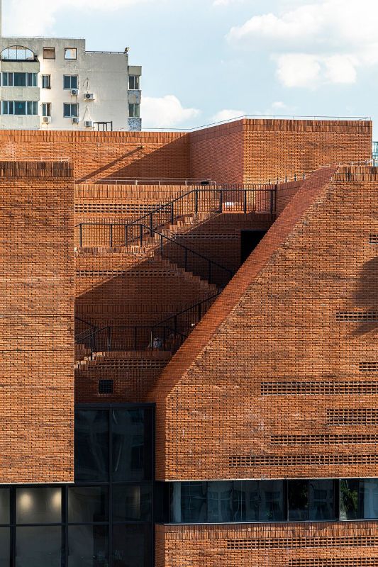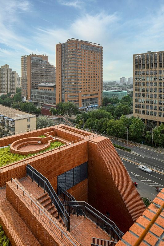 屋頂花園為立面設計策略提供了參考,因為URBANUS希望將底層大廳與屋頂連接起來。選擇紅磚幕墻系統是為了與清華大學的材質相聯系,清華大學位于城府路的北部。磚塊創造了一個均勻的立面處理,而玻璃元素和穿孔則增加了透明度和節奏感。
