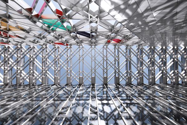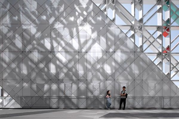 ZXD建筑事務所的格子外墻包裹著五棵松冰上運動中心,呈現出如冰裂一般的視覺效果,同時引入了復雜、有層次的空間體驗。重復的模式是為了掩蓋這個街區的體量,并使建筑的輪廓更加輕盈和隱蔽。網格墻和主立面之間有一條名為冬奧會的走廊,成為一個具有儀式感和紀念意義的空間。當自然陽光穿過建筑時,光和影的圖案效果就會投射到地面和外墻。