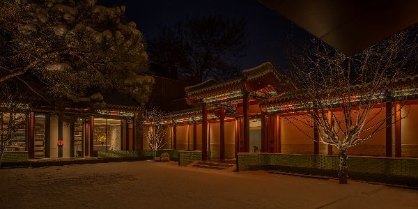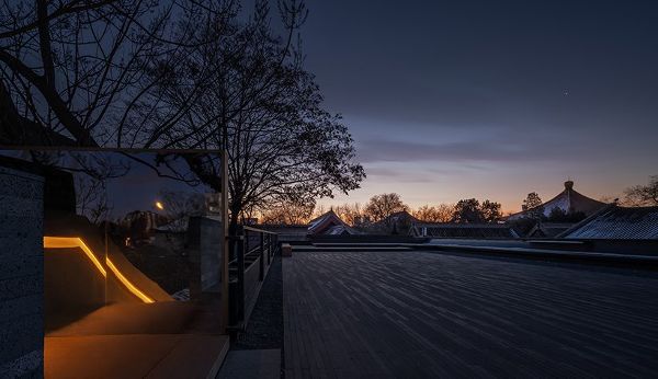 該典型的四合院,有三個連在一起的院子,周圍是一系列帶有傳統的灰色瀝青瓦屋頂的房間,由一條貫穿大院中間的走廊連接。人們從入口處穿過一個拱門,通過走廊進入第一個院子,大理石鋪路石鑲嵌在景觀水道中,通向一個被竹子“森林”半掩蓋的開放式廚房。入口的右邊是一個露臺,作為一個觀景平臺,客人可以俯瞰院子、北京的帝國古老學院和院墻外的胡同。LDH在露臺層的樓梯墻壁上安裝了鏡面板,所以在客人踏上露臺之前,可以看到北京老城的倒影和北京的帝國古老學院的金頂。