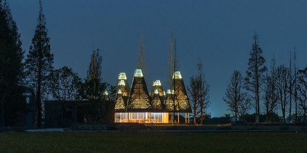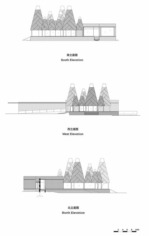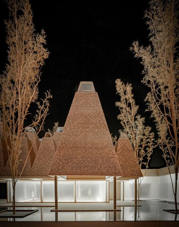 GOA開發的這個項目是為中國村莊的整個社區提供一個溫馨的公共客廳。工作室將附近水杉樹的形態轉化為一種純粹的幾何建筑語言,作為設計的特色標志和模塊的靈感。建筑頂部的金字塔形模塊有三種不同的尺寸,它們混合在一起,形成一個連續的樹冠結構,在自然界中描摹出一個人造森林的輪廓。