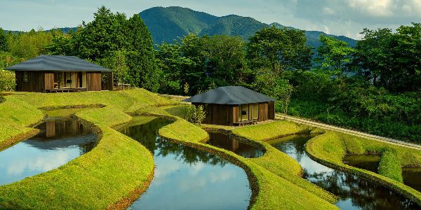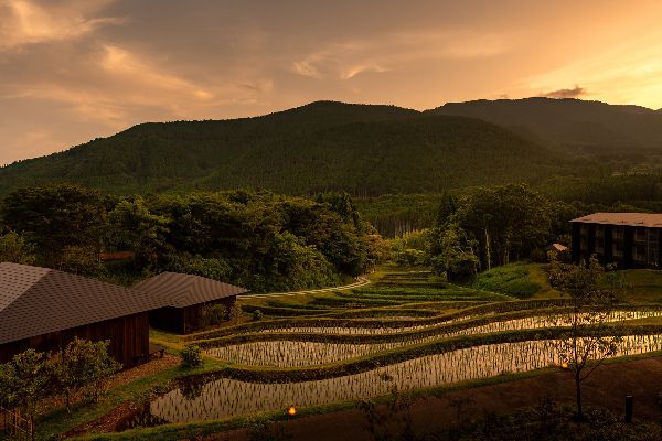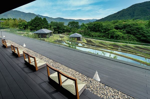 隈研吾設(shè)計(jì)事務(wù)所將其為星野度假村新建成的酒店組織成一個(gè)小型建筑群,散落在山坡的景觀中。該旅館配備了45間客房,有的位于主樓內(nèi),有的作為獨(dú)立的套間。提供兩種不同風(fēng)格的套房。一種是作為獨(dú)立的建筑矗立在水稻梯田上,可以看到雕刻好的風(fēng)景和遠(yuǎn)處的山脈。第二種類(lèi)型面向周?chē)匿忼X橡樹(shù)林,有自己的私人戶(hù)外溫泉浴池。