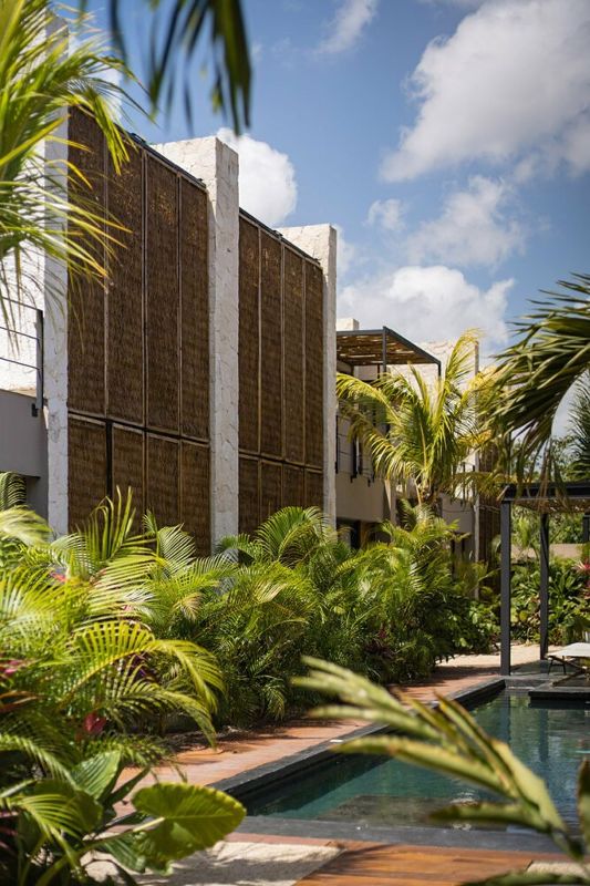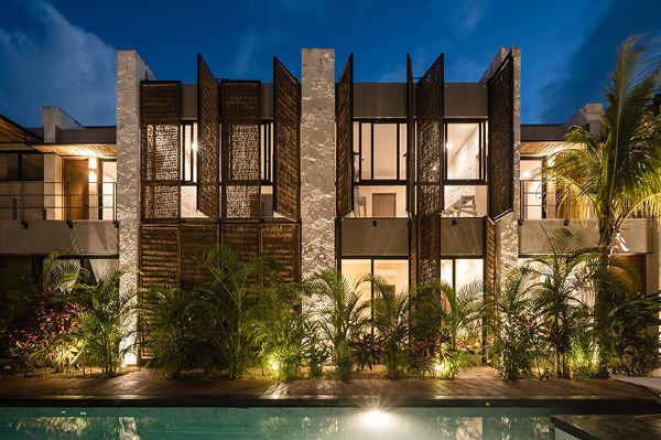 這個外墻是由巨大的、可操作的百葉窗組成的,可以根據居住者的需要折疊打開或關閉。這是一種內在的狀態的表達,表達了使用者的當時的情況。除了當地的藤蔓植物,該團隊還利用了該地區的各種材料。這些材料包括藤條、“瑪雅景觀采石場”、Chukum灰泥和Parota木材。該團隊繼續說:“它的設計、材料的選擇、色調和植被尋求產生一個平靜和和平的空間。該項目探索了內部和外部、社區和私人空間的持續關系,照顧到了與周圍環境的輕松和尊重的氛圍”。
