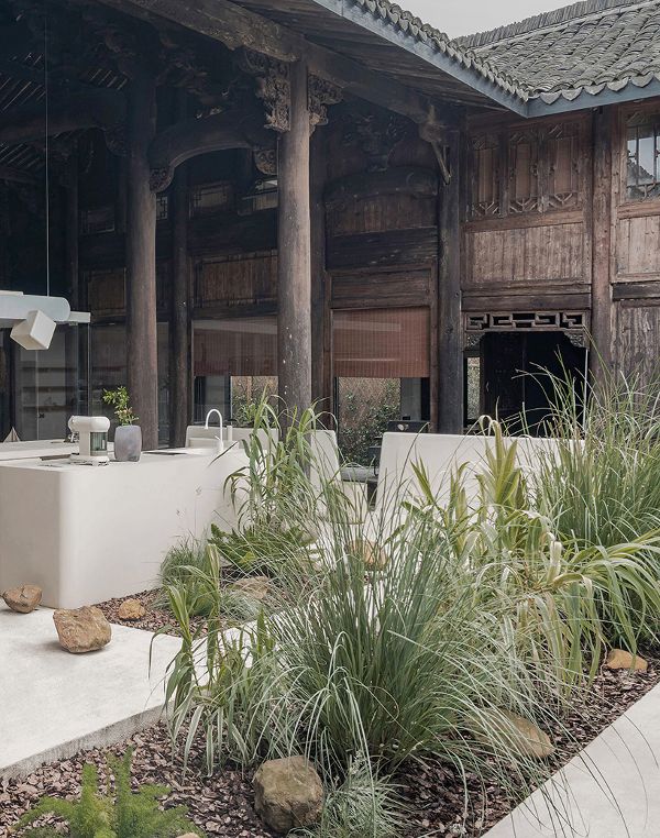 保持中國文化特色,木質結構被保留下來,以現代的形狀來支持基礎設施。極簡的幾何形狀補充了傳統設計,形成了新的休閑和茶會空間。充分展示傳統風格建筑,建筑師增加了現代家具,以喚醒當代和傳統的交匯意識。屋檐下懸掛定制的吊燈,為空間提供了復古的美感。