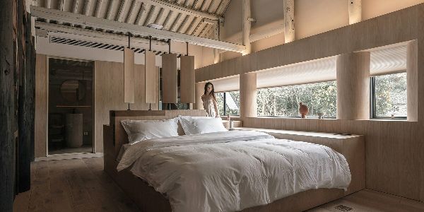 “注意”設計工作室將中國杭州的一座百年老建筑改造成了現代茶室和賓館。這座歷史悠久的住宅位于龍塢山的森林中,建于清朝時期,屬于徽派建筑。這種古老的傳統住宅建筑風格大多使用磚、木梁和石頭,反映了該地區的山地特征。獨特的木質框架,由“新月形”橫梁和“支架”構成,為現代功能的附著提供了環境,并為房屋注入了新的生命。