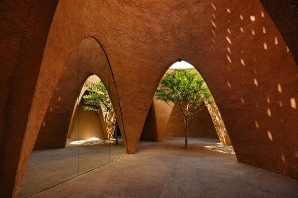 錐形結構圍繞著三個綠色庭院排列,房間的序列從充滿陽光的空間逐漸過渡到陰影空間,入口處有傾斜的拱門。