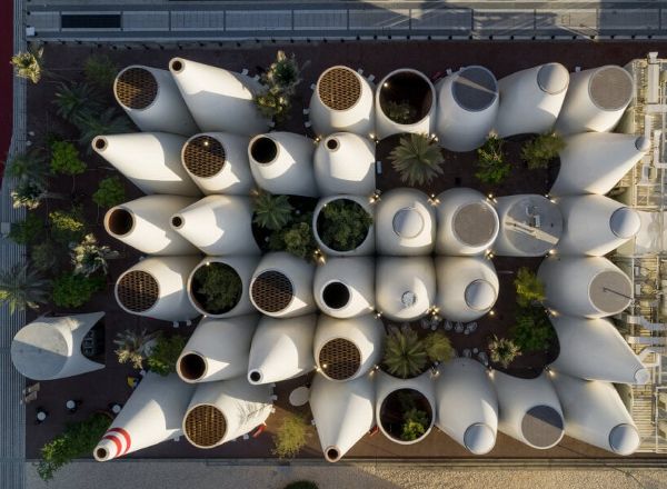 Querkraft建筑師從歷史上的風塔和傳統阿拉伯粘土建筑的氣候調節特性中汲取了概念,將兩者融合在一起,建造了38個不同高度和不同開口的錐形結構,奧地利世博會的展館。