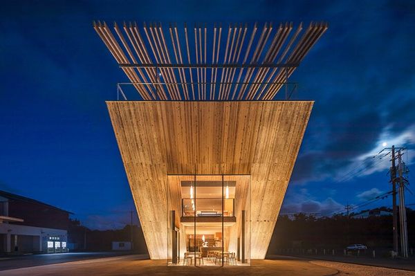 當夜幕降臨時,暖色調的燈光使質感十足的外墻和屋頂涼棚變得生動起來,為鳥取高濱咖啡館增添了戲劇性的色彩,同時又不失充斥其空間的固有的親密氣氛。