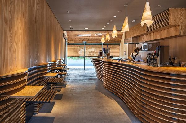 設計者解釋說:“鳥取縣以民間工藝("Mingei")文化而聞名,隈研吾設計事務所出于對鳥取縣的致敬,于是將當地的工藝融入到咖啡館的內部裝修中。主席臺用交叉層壓木材設計的,而吊燈是用當地沙子的和紙制作的。浴室水槽是由鳥取民藝陶器作坊Nakai-gama制作,它采用了綠色和黑色釉面的美麗組合”。