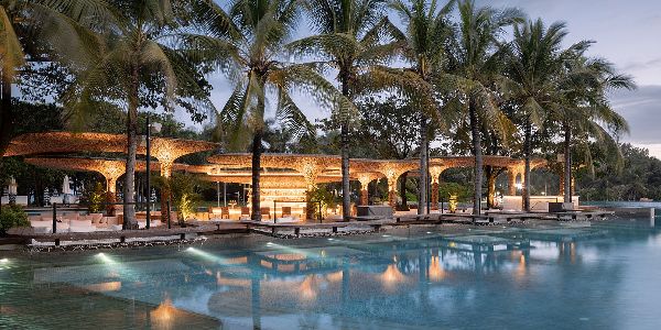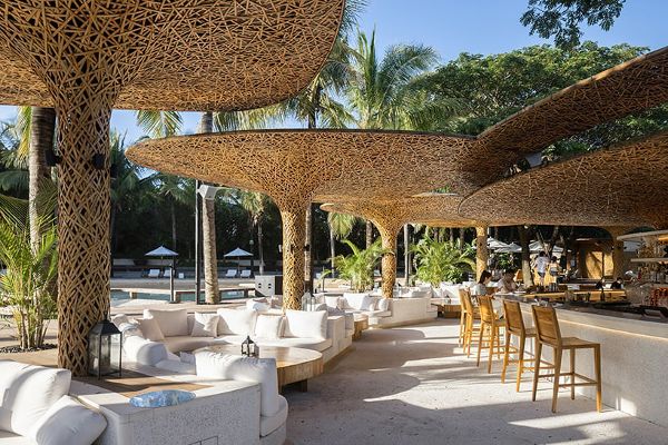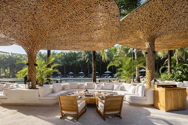 擁抱三亞如詩如畫的環境,Various Associates設計了“樹下”的設計概念,讓客人沉浸在海南島的景觀體驗中。海灘俱樂部由郁郁蔥蔥的綠色植物、有機的色調和紋理以及柔和的燈光來定義,頂部是竹編結構的雕塑波。這五棵樹以不同的高度和形式排列,似乎從地面上的植物床中有機地浮現出來,重疊在客人的設施之上,創造出親密而開放的空間,供人們交際和放松身心。