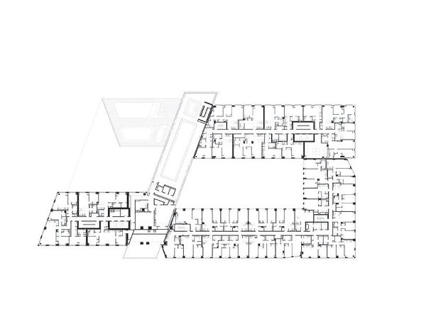 階梯將塔樓分為七至八層,與鄰近建筑的規模相呼應。外立面加強了這種細分,借用了綠點聯排別墅常見的瓦片覆蓋層的語言。預制混凝土板的網格由有角度的平面雕刻而成,每個街區的方向交替進行,形成動態的浮雕效果,對太陽的運動做出反應。