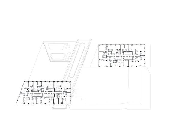 42,000平方英尺的設施分布在建筑群的中心,形成循環。兩層的室外露臺模仿了塔樓的變化形式,有角度地切入庭院,并向海濱開放。在它們的上方,能俯瞰曼哈頓天際線的便利設施橋將兩座塔樓連接起來。