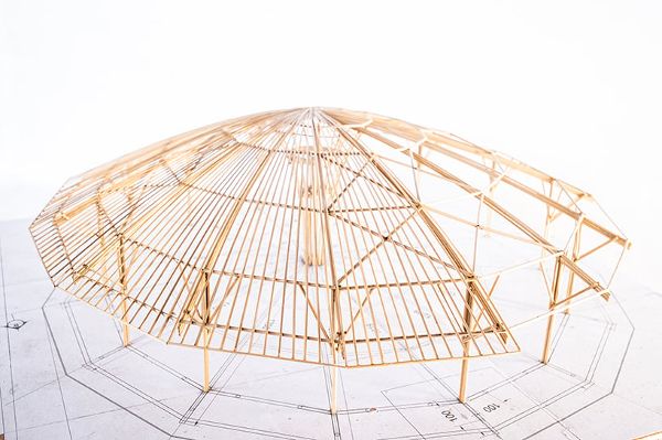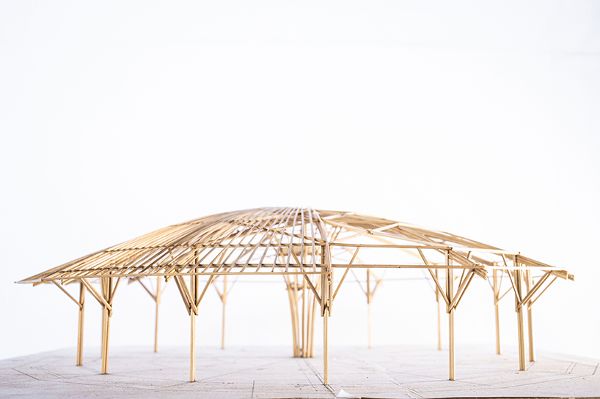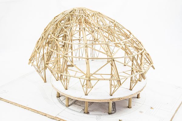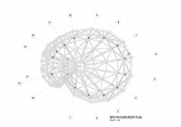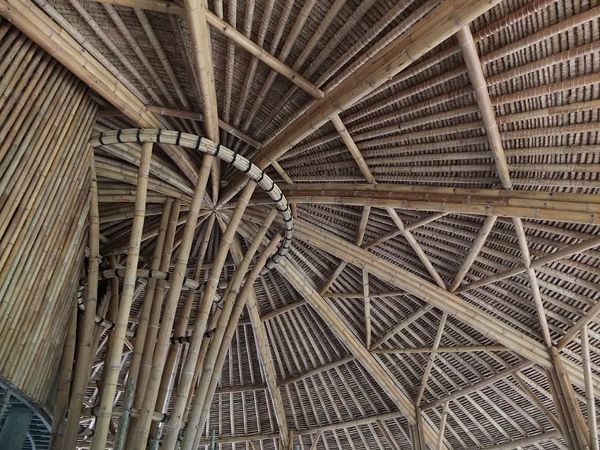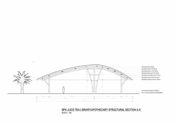 建筑群遵循由十四根柱子組成的計劃,這些柱子由耦合的桿子制成,并用傾斜的支撐物加固,在中央竹塔的幫助下減輕屋頂的重量。 屋頂結構由十四根由三根桿組成的梁組成,徑向放置在垂直支架上。 五階線性檁條形成屋頂的圓形形狀,并為最后一層椽子提供支撐。 竹子交叉系統加固了結構,而懸掛在排水溝線上的天然印度尼西亞茅草“alang-alang”提供了遮陽避雨的保護,并形成了天篷的最終外觀。