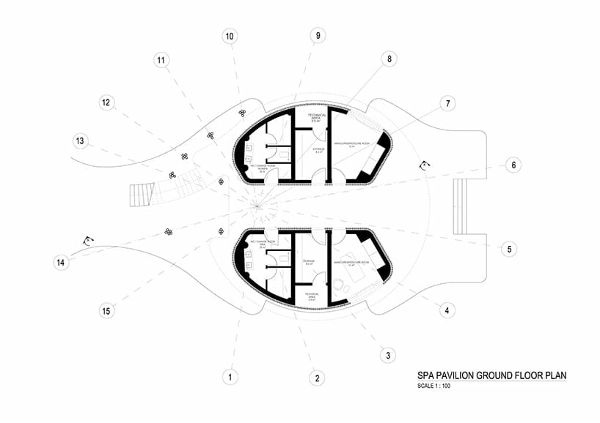 高架人行道通向水療館,該水療館在地面和服務空間安排了兩層樓的水療休閑功能,以及在上層的多功能廳。 長長的傾斜柱子形成了建筑物的入口,竹子覆層覆蓋了混凝土結構,始終保持著自然的外觀。 屋頂支撐系統由傾斜的竹柱制成,位于混凝土板上。 一樓規劃了一個圓形開放區域,在板的周邊組裝了必要的支撐元件。 屋頂懸垂保護竹結構免受陽光和雨水的影響,同時構成海景。 “alang-alang”茅草網制造了一個復雜的紋理,在山頂點形成了一個天窗,固體透明的抗紫外線聚碳酸酯可以為空間提供天頂照明。