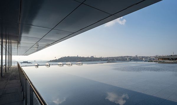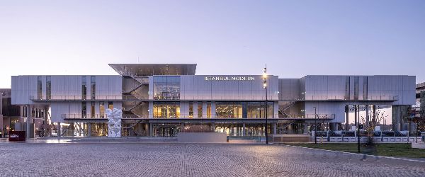 伊斯坦布爾現代藝術博物館建筑由地面上凹陷的透明玻璃立面上方的一個體量組成。成型的金屬板立面反射博斯普魯斯海峽的光和水,營造出隨太陽運動而變化的動態外觀。公園一側的樹葉會在立面上產生不同的圖案。建筑體量在東西兩側創造了一個雙重高度的空間,為下面的活動提供庇護。它在西面面向老城區,東面是加拉塔港新開發區的游客。