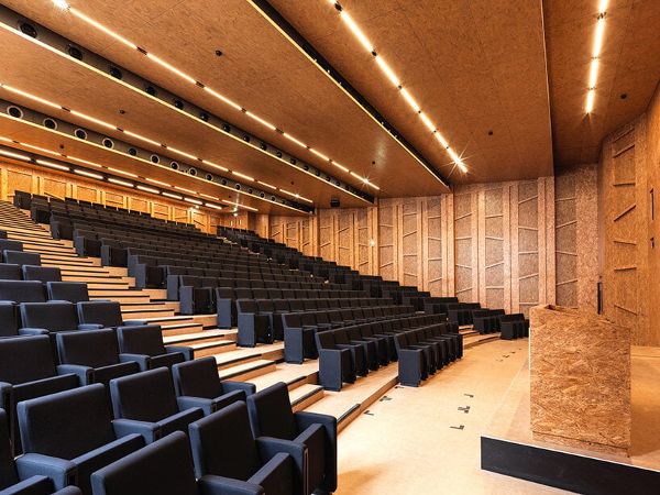 Groupe-6設計的研究區位于中庭的東面,沿Rue de la Recherche設有最先進的實驗室、研究人員的工作空間和愉快的會議場所。設計中特意使用了一些簡單的元素,如玻璃、光線和白色的表面,與之形成對比的是使用了穿孔吸音OSB木板,利用可持續的低成本材料創造出視覺上的溫暖氛圍。該建筑群通過地熱井與大學的能源網相連,并獲得了符合法國綠色建筑高質量環境標準的認證,具有很高的能源效率。