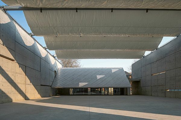 一臺(tái)巨大的鋼梁滑動(dòng)起重機(jī)從北向南橫跨混凝土墻。 這些倒拱形帆布主要用于懸掛藝術(shù)裝置,也可用作抵御天氣的保護(hù)罩。工作室解釋道:“根據(jù)天氣和日照角度,這些倒拱帆布可以隨意開合,起到遮陽(yáng)、防雨的作用。這是一個(gè)人們聚集的地方,是開幕式和戶外展覽的場(chǎng)所”。