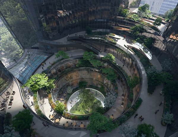 該中心融合了辦公、公寓、酒店、購(gòu)物和餐飲設(shè)施以及文化和娛樂設(shè)施,每天將容納超過20,000人,是一個(gè)與城市新中央公園和江邊濕地相鄰的綜合垂直社區(qū)。從地面上的共享中央庭院向上移動(dòng)到中心的天橋露臺(tái)和圍繞中央峽谷的屋頂花園,設(shè)計(jì)在一系列交織的公共空間中創(chuàng)造了一個(gè)多層次的城市萬花筒。