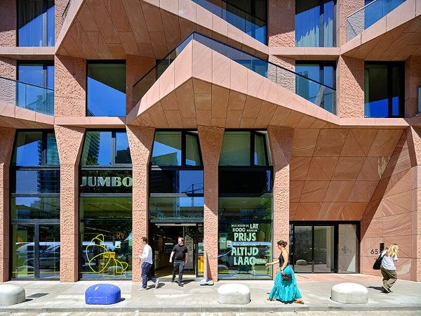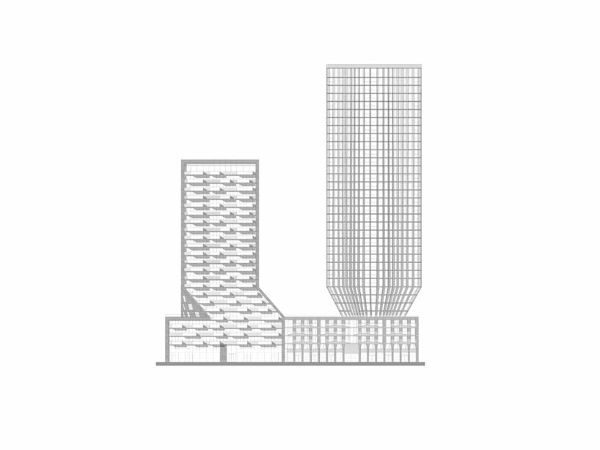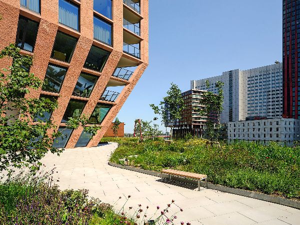“超新星公館”大廈獨特的建筑輪廓是條形碼建筑事務所對鹿特丹KCAP地區城市規劃的創造性回應,該規劃規定了特定的容積率。為了滿足這一要求,建筑師們做出了一個大膽的決定:在底部減去體積,而在頂部增加體積,從而使塔樓看起來像雕塑一樣矗立在基座上。這種細長的結構優化了鄰近建筑的視線和自然采光,同時為住戶提供了面積達1,600平方米的屋頂花園,“超新星公館”大廈和“沉思”大廈的住戶均可享用?;▓@位于五層而非屋頂,與地面設施無縫連接。