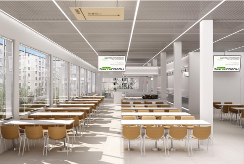 主要功能為餐廳,同時配備小賣部和獨立檔口,可供150人左右共同就餐。衛生間重新改造,原打印室位置改為連廊空間。餐廳后廚和就餐區面積約550平方
