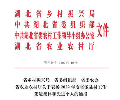 近日,省鄉村振興局、省委組織部、省委農辦、省農業農村廳聯合印發《關于表揚2022年度省派駐村工作先進集體和先進個人的通報》(鄂鄉振文〔2023〕19號),湖北聯投駐興山縣黃糧鎮火石嶺村工作隊獲評“2022年度工作突出駐村工作隊”稱號,駐興山縣黃糧鎮火石嶺村工作隊員干志文、湖北聯投清能集團駐咸豐縣朝陽寺鎮五龍坪村工作隊員李力昕被評為“2022年度工作突出駐村工作隊員”。
