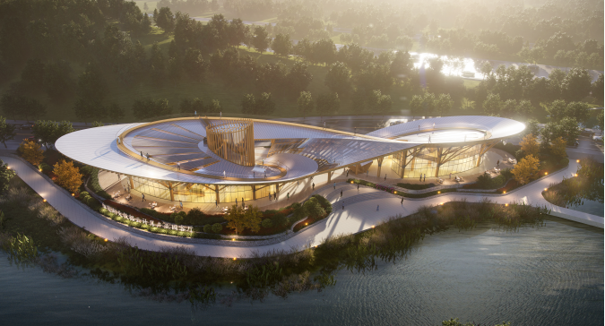 “云端”,既契合了紅蓮湖大數據云計算產業實體經濟,也釋放了市民可在此建筑自由行走、充分享用城市公共空間的福祉。“樹下”則勾勒出了建筑造型與木構材料的關聯性。園區客廳與商務區、展示區、配套區一起,環繞核心景觀綠洲布局,多維度鏈接起整個產業生態,作為整個產業園區的商務客廳,園區客廳以自由曲線、流動形態,攜公共屬性自居C位,當仁不讓地成為最受歡迎的“新城之美”。