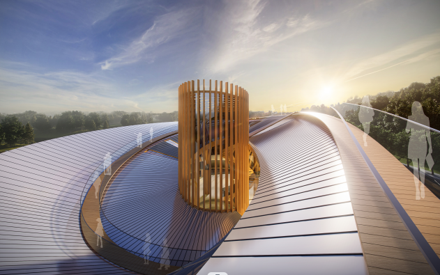設計團隊運用8字形雙坡上人屋面巧妙地將東西地塊整合。從地面上升到屋頂,從屋頂又回到地面,8的線條作為紐帶鏈接了建筑空間的上與下、內與外,引導游客感受建筑與環境間不同的空間關系,創造富有儀式感和趣味性的體驗。而這個利用參數化技術手段設計和建造的流暢8字形屋面,也將優美的曲線造型與精細的新型木構技術一并呈現。