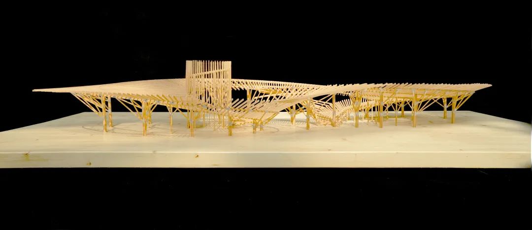 同時考慮到人流主要來自公園,所以建筑東邊出檐更深,起翹更大,面向公園主入口呈懷抱之勢成為“被看到的景色”。傘狀木柱支撐起巨大的室內外木結構玻璃雨棚,天窗投射下變化的光影,猶如盛夏濃密樹冠之下光影斑駁又涼風習習的愜意納涼空間,營造出令人流連的感官體驗。