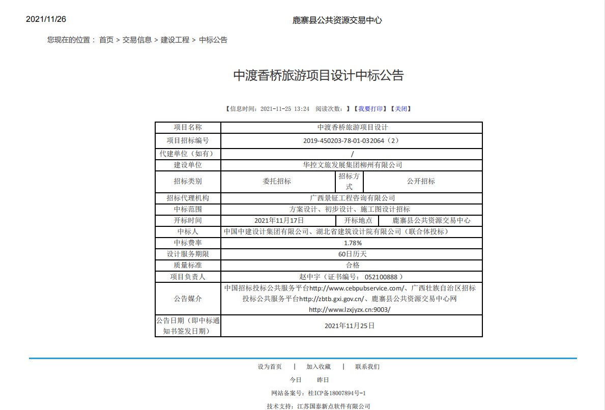 2021年11月25日,聯投集團旗下湖北省建筑設計院有限公司(簡稱省建筑設計院)中標“中渡香橋旅游項目”設計。該項目總投資106558.98萬元,中標金額1306.19萬元。