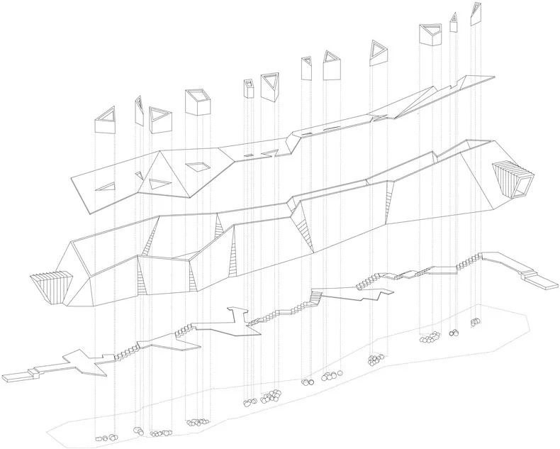 我們以舊窯群形象作為地質公園的標志性大門,窯頂則改造為觀景平臺,其中一個舊窯的出灰口被設置為博物館的主入口。我們在博物館開辟了各種大小不一的露臺,使得觀眾可以從各個角度全方位看到窯群及遺留下來的山脈。