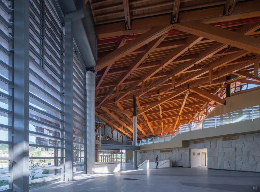 傳統的木結構建筑環保性極強,可以降解與再利用,并且與當地的山水自然相呼應。但木結構也受到了跨度性、技術性等實際條件的制約。因此我們決定將木結構與現代科技相結合,通過數字化來定制復雜的構建、精確切割的角度,大大提高了工作的效率,做出現代木結構向土家族致意并彰顯當代的時代精神。