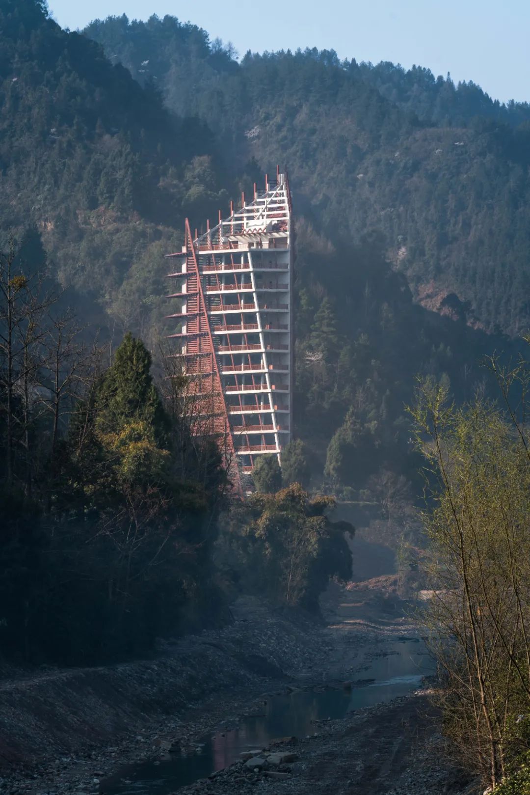 “摩霄樓”是中國土家泛博物館(彭家寨)建設范圍內的重要建筑,樓名取自土家方言,有接近云天之意。”摩霄樓”坐落于距彭家寨1千米之外的汪家寨,形體以三棱柱為原型而來,利用銳角所帶來的透視效果以及木格柵立面的疏密淅變強化建筑的體量感和直上云霄的氣勢。樓體適度旋轉,可以很好地觀看到彭家寨的景色。“摩霄樓”高79.85米,總建筑面積3800平方米,具有觀光休閑、藝術展示、商業服務等多種功能。
