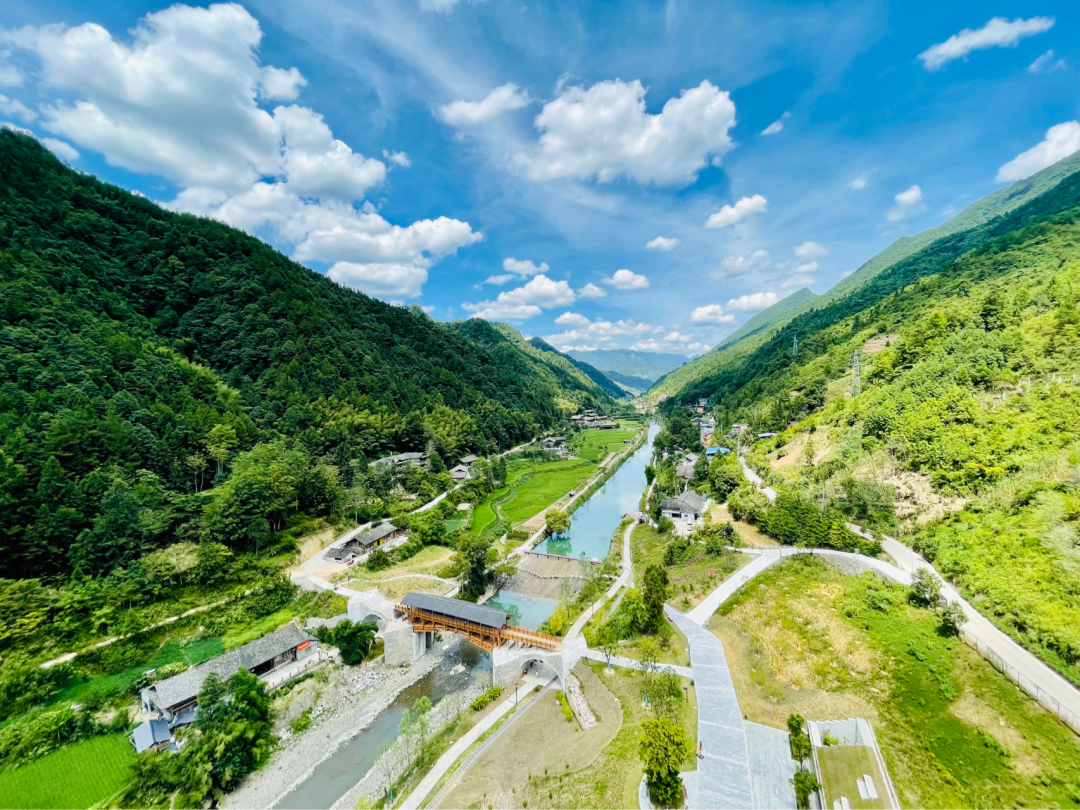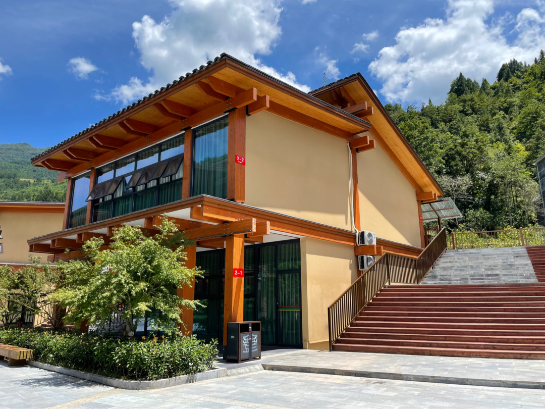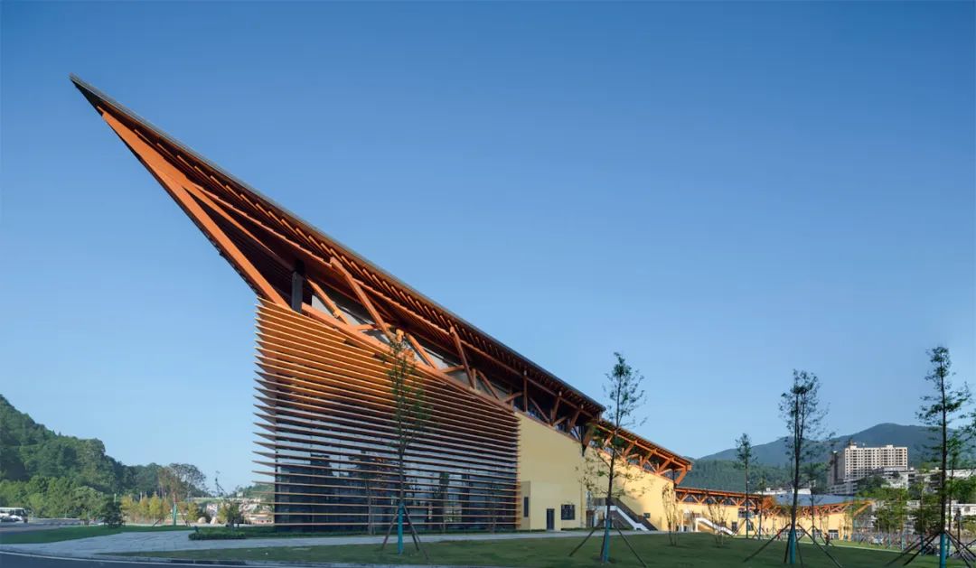彭家寨國際研學營位于墨客橋和摩霄樓中間,以大跨度復合木結構設置了具有強烈公共性的空間,這種通透性在研學中心和遠山之間建立了自然的聯系。