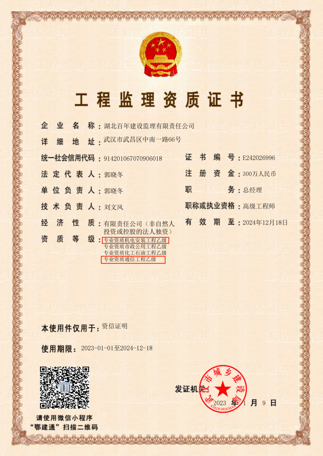 近日,經武漢市城鄉建設局審核批準,湖北百年建設監理有限責任公司(以下簡稱“百年監理”)喜獲機電安裝工程乙級和通信工程乙級兩項資質。