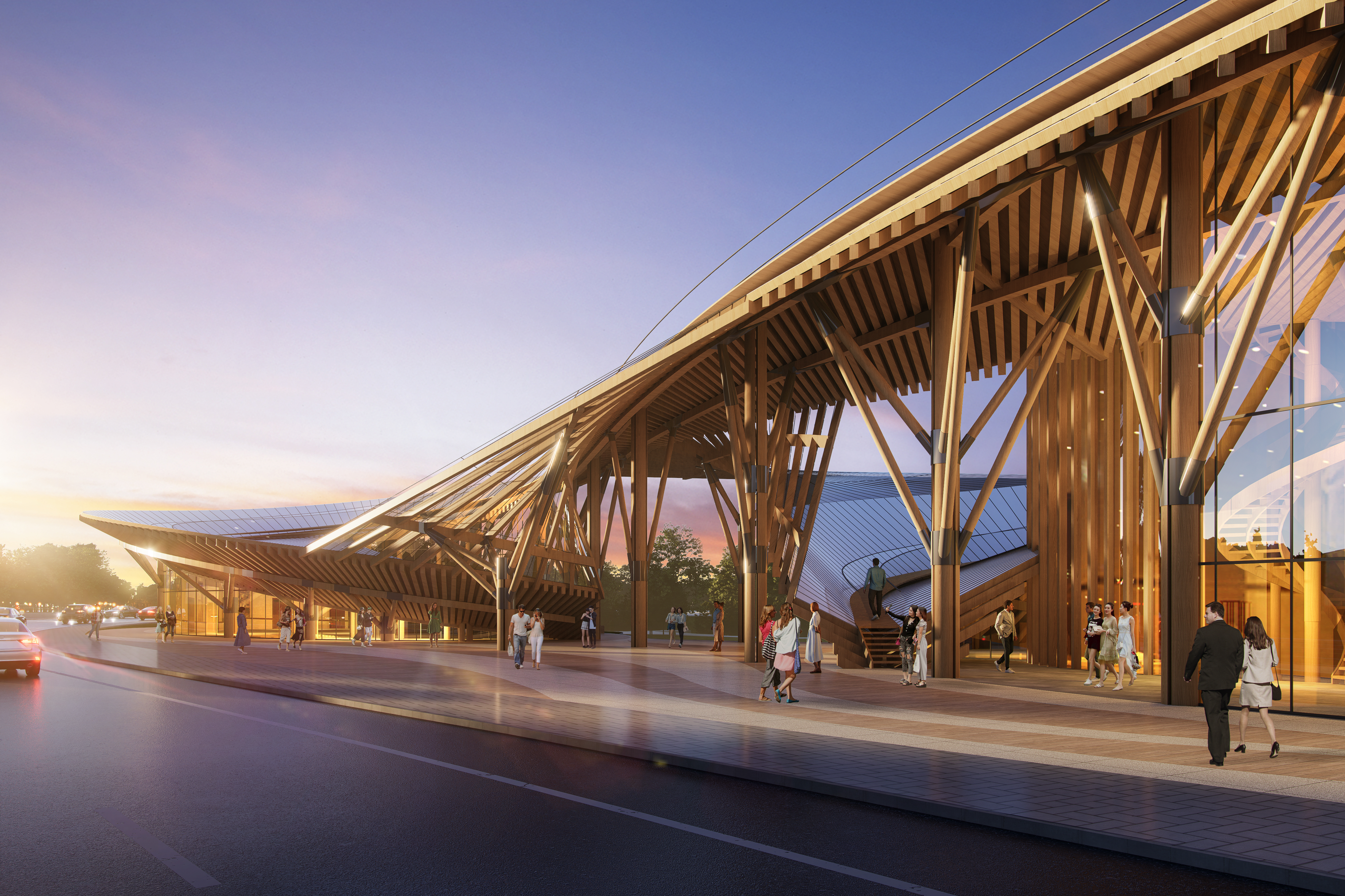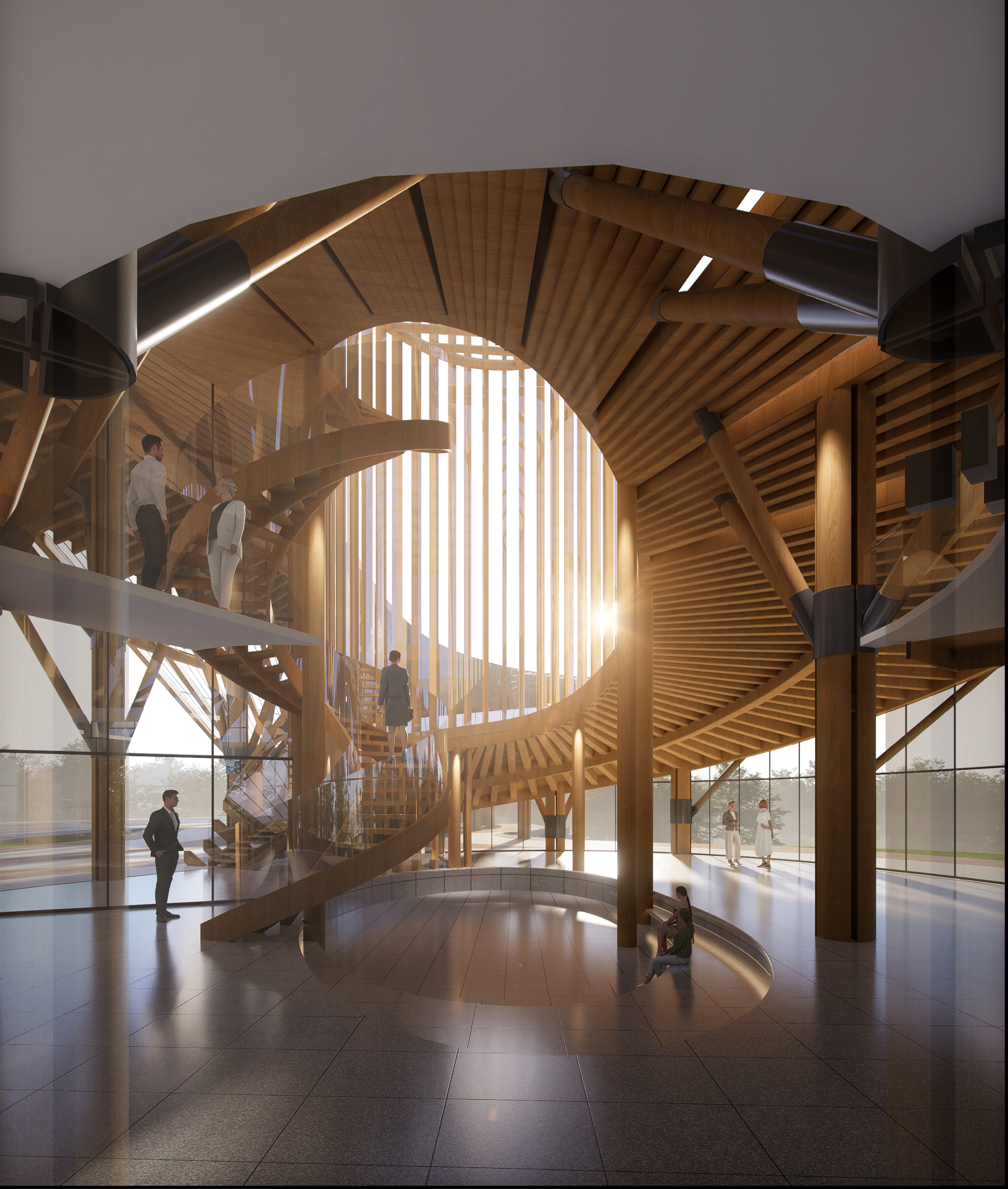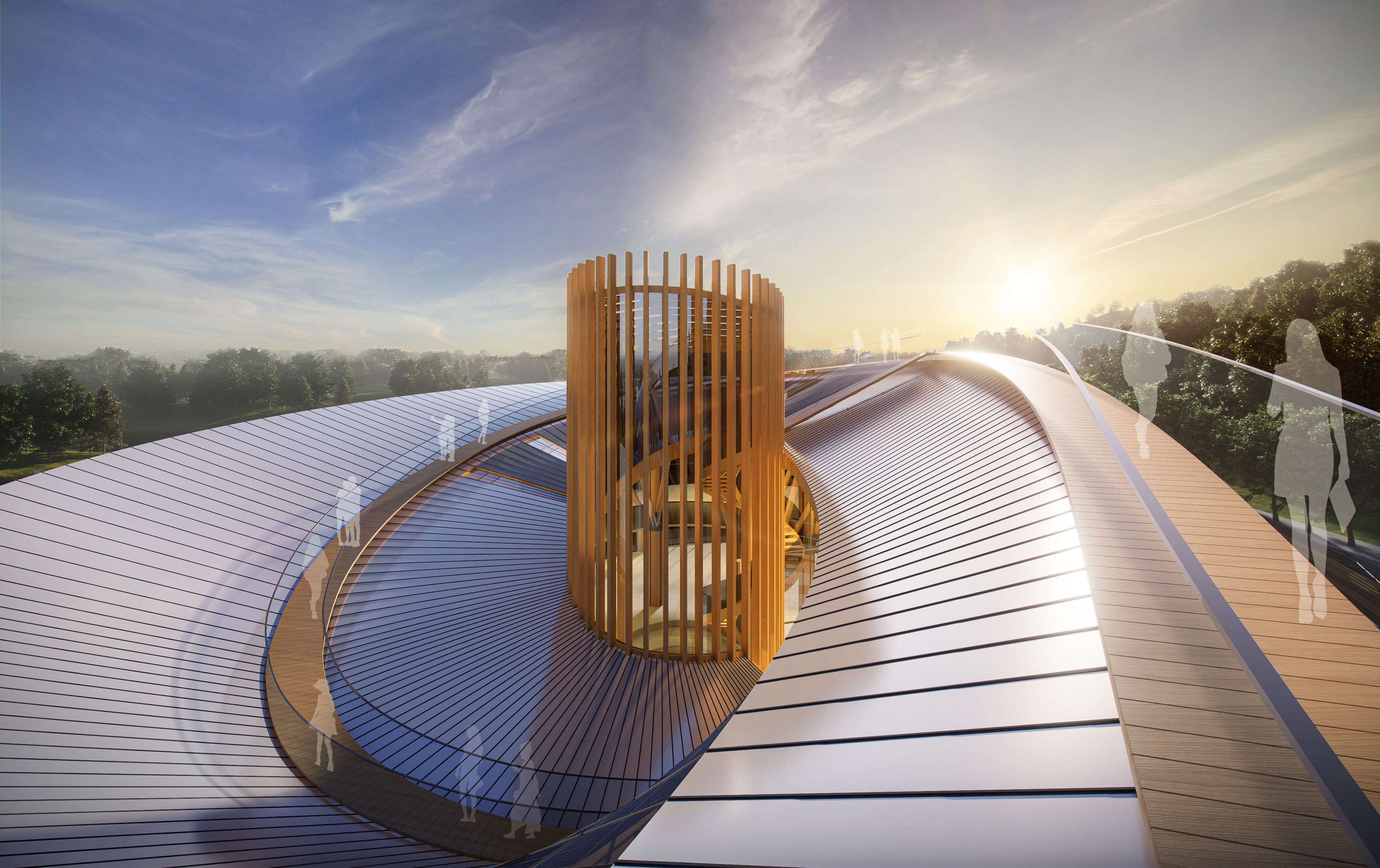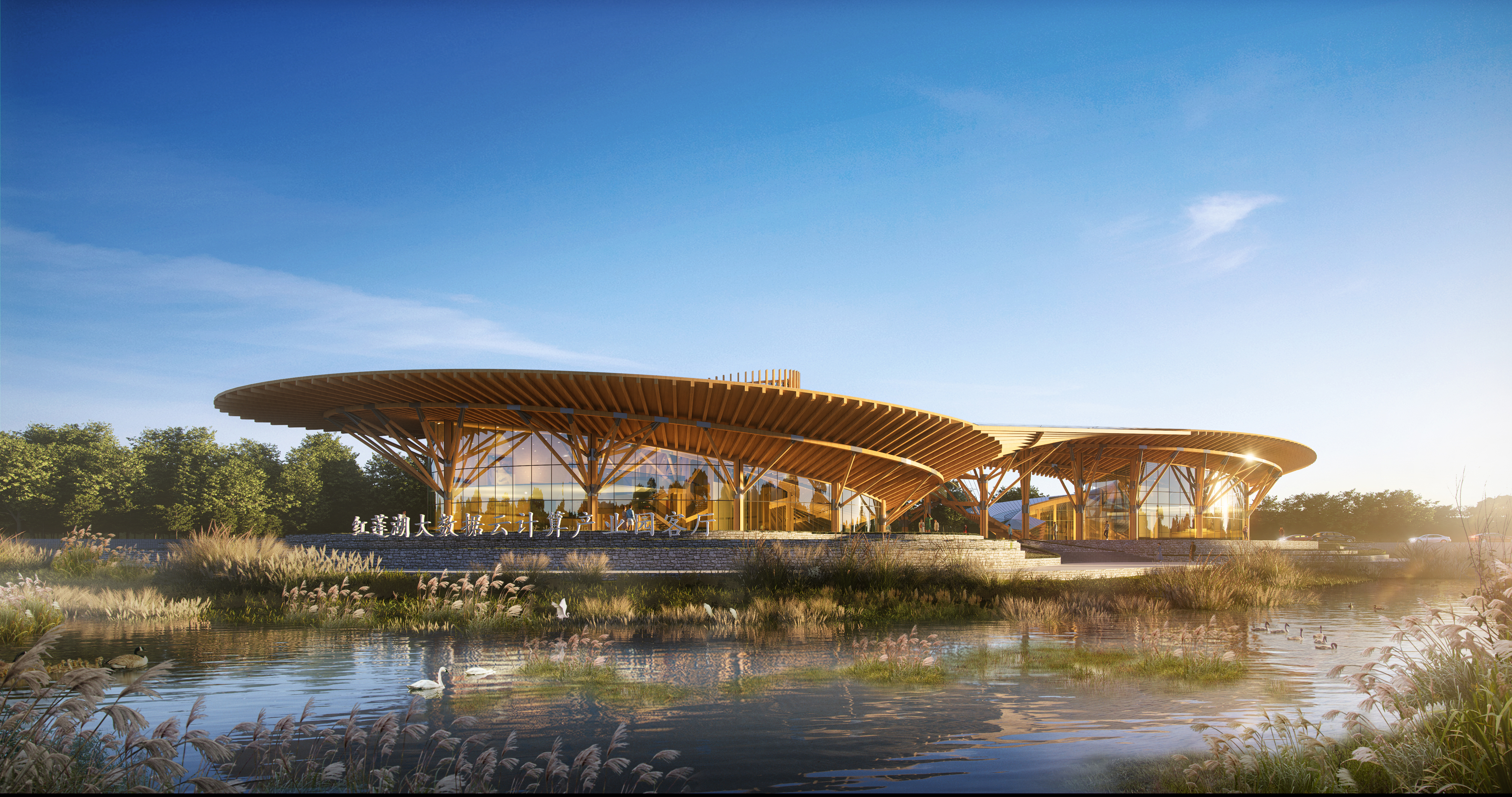 由湖北聯(lián)投·省建筑設計院李保峰工作室設計,運用參數(shù)化設計方法生成8 字形上人雙坡連續(xù)曲屋頂。深遠的挑檐、重復但變化的檁條、角度各異的木柱斜撐、流動的曲線與木構的力量并存,試圖利用現(xiàn)代木構的技術去探求更多的自由形式和視覺、空間體驗。