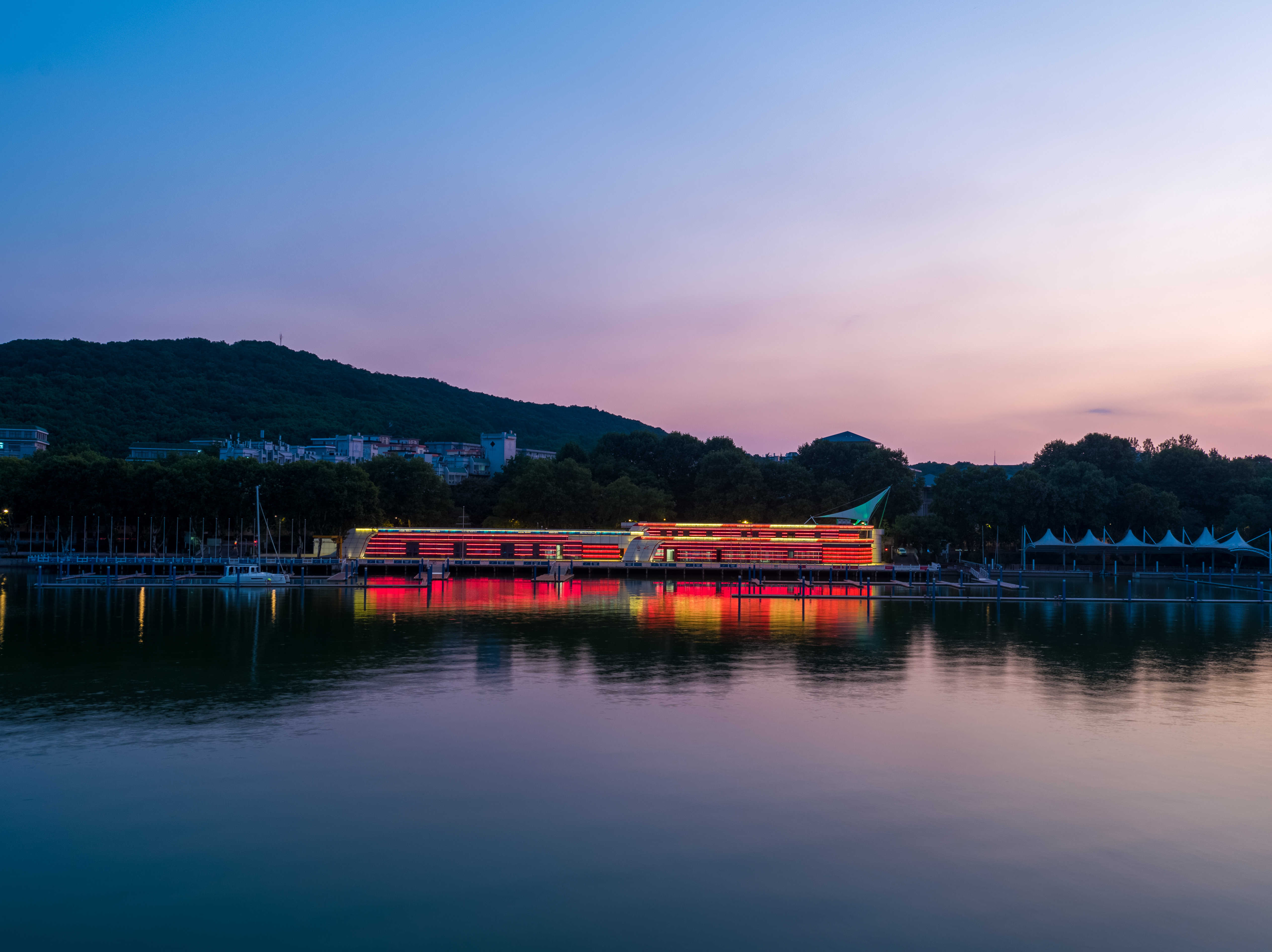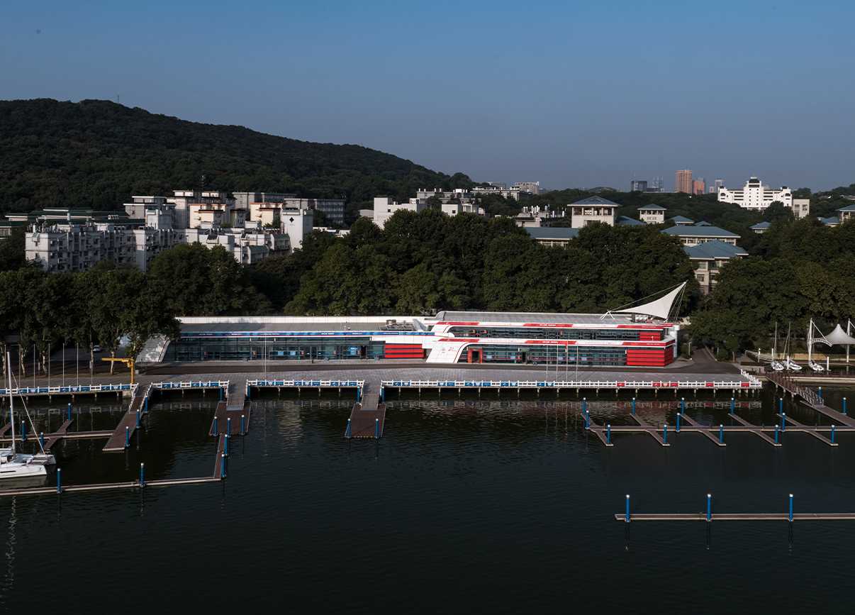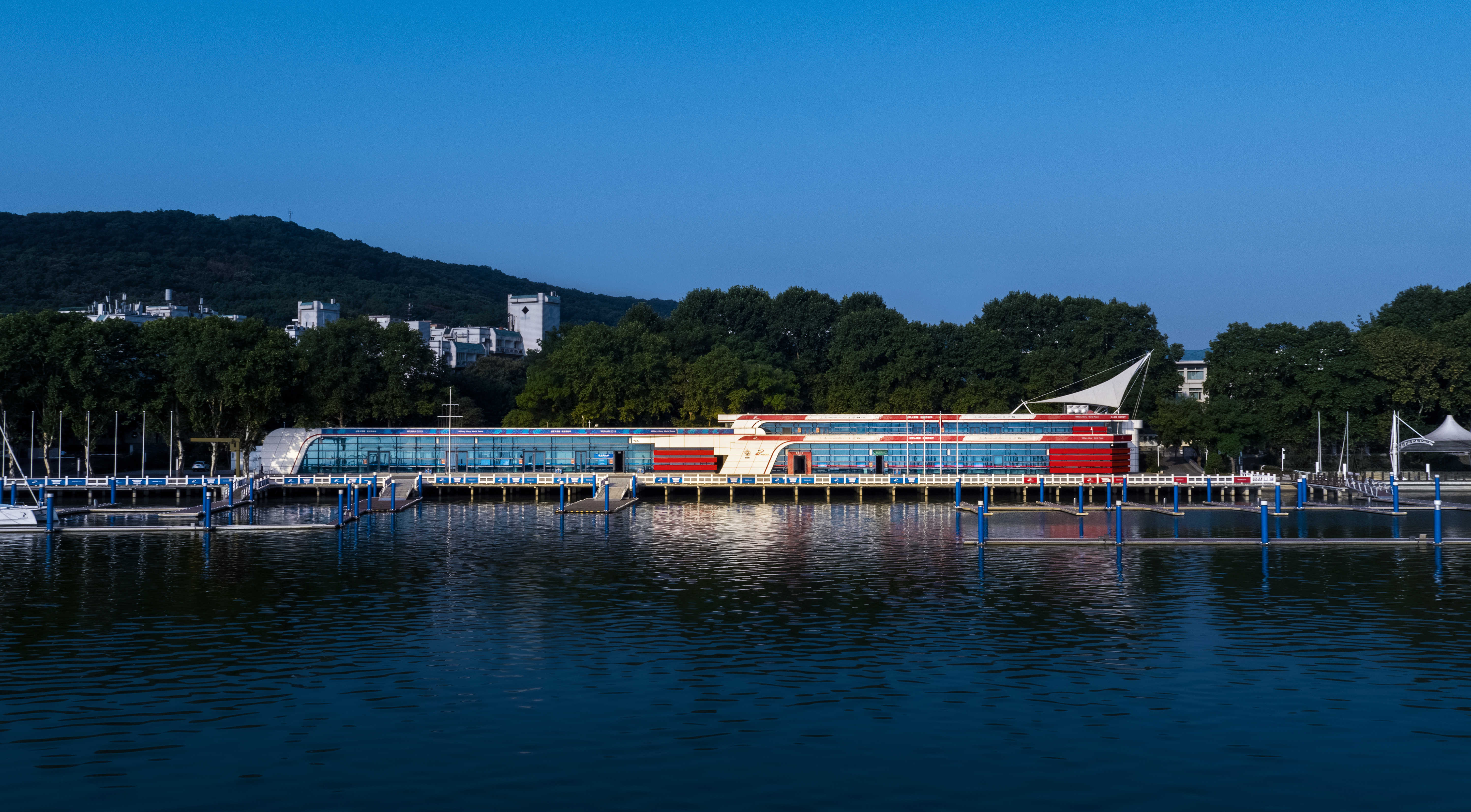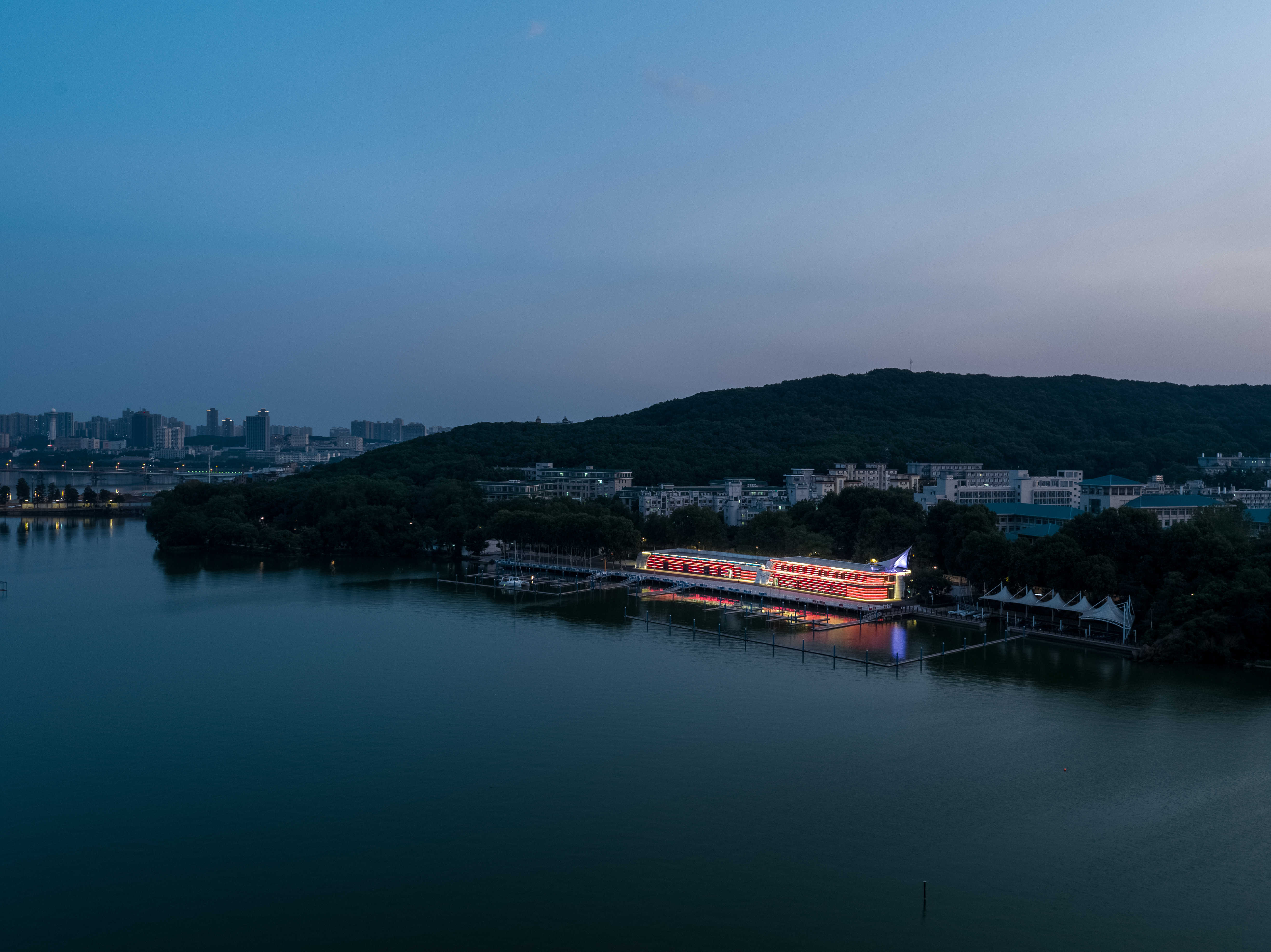 本項目為改造項目,旨在打造東湖景觀新亮點。帆船競賽場地建設在建筑造型上取“千帆競渡,百舸爭流”之寓意,從帆船抽象出建筑外殼的輪廓,下面的玻璃寓意水面,從遠處看如同層疊競技的帆船航行于東湖之中。